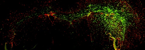 Мышиный мозг, заражённый человеческой глиомой (окрашена зелёным) — одной из самых опасных и тяжело детектируемых опухолей