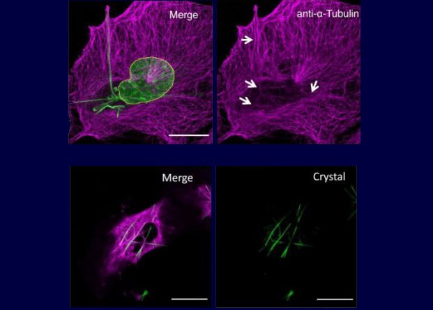Ученые продолжили работу и выяснили, что скорость образования кристаллов в клетке и их размер зависят от активности кинезина-1 в клетке. В тех культурах, где клетки производили мутантный (неспособный шагать по микротрубочкам) двигательный белок, количество кристаллов уменьшилось на 87 процентов, и остаточная активность, скорее всего, связана с небольшим количеством обычного кинезина в клетке. Когда ученые подавляли выработку кинезина в клетках, кристаллы исчезали.